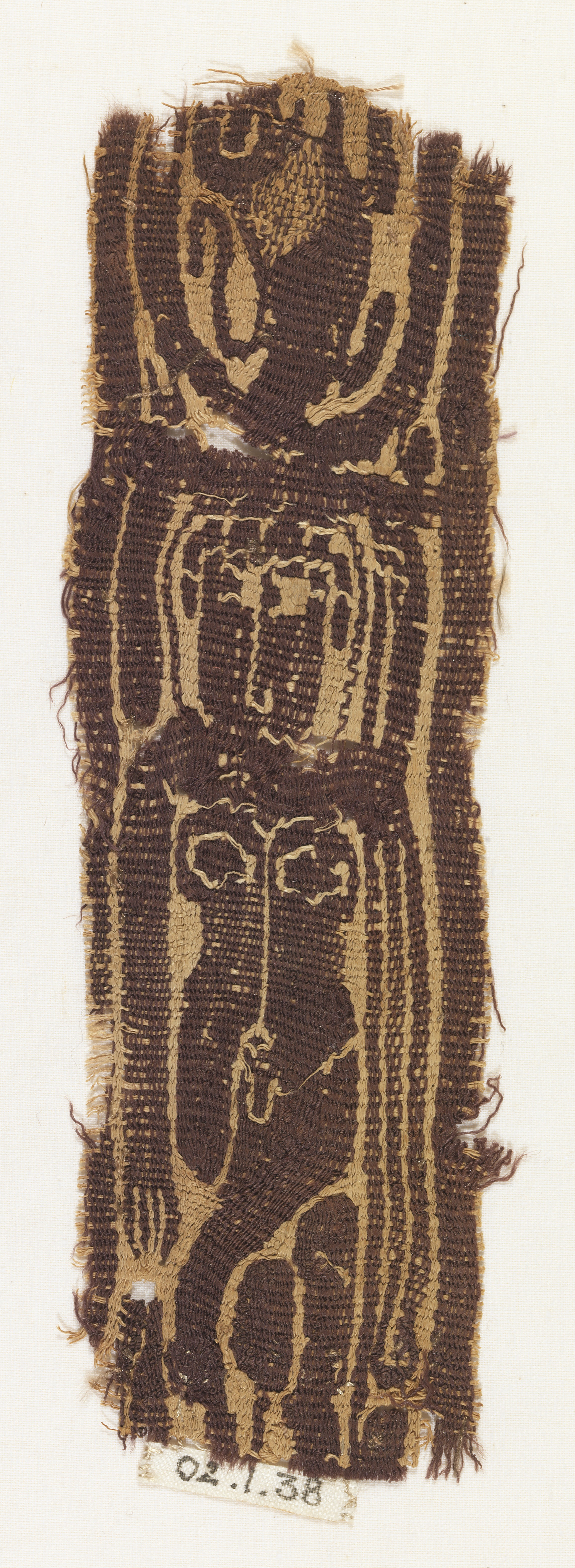 This is a Band fragment. It is dated 5th–7th century and we acquired it in 1902. Its medium is warp; s-spun linen. weft; z-spun linen, z-spun wool and its technique is slit tapestry woven with supplementary weft wrapping. It is a part of the Textiles department.
