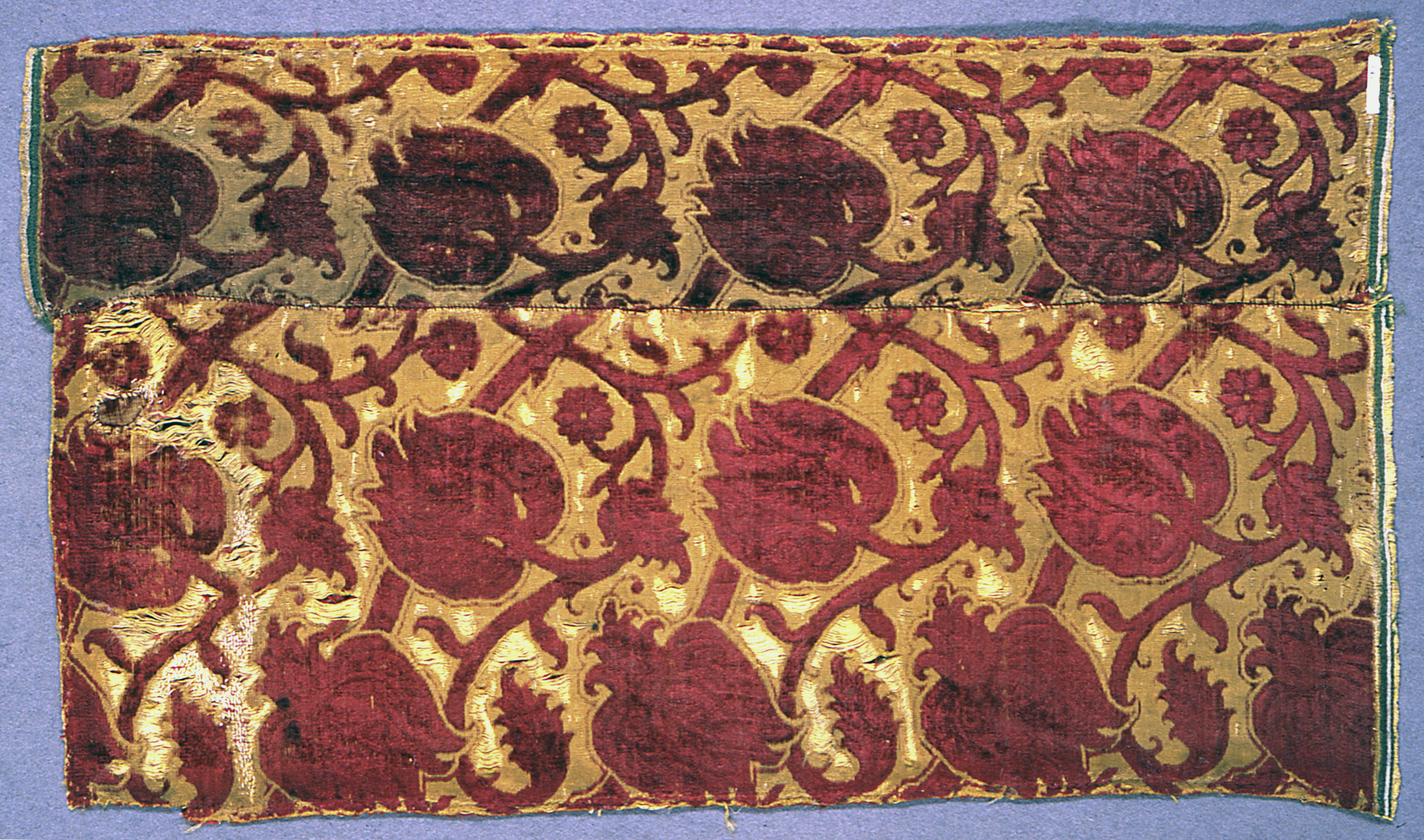 This is a Fragment. It is dated 17th century and we acquired it in 1902. Its medium is silk and its technique is supplementary warp in cut and uncut pile on a satin foundation (velvet). It is a part of the Textiles department.