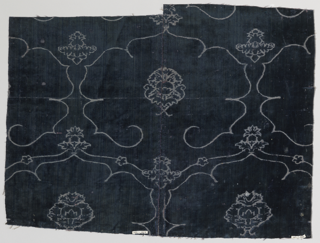 This is a Fragment. It is dated 15th century and we acquired it in 1902. Its medium is silk and its technique is supplementary warp pile in a 4&1 satin foundation (velvet). It is a part of the Textiles department.