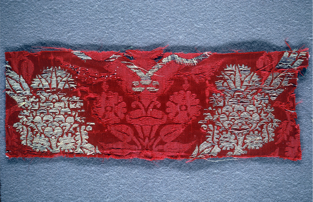 This is a Fragment. It is dated 17th century and we acquired it in 1902. Its medium is silk, metallic. It is a part of the Textiles department.