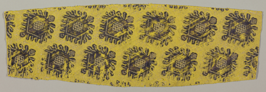 This is a Fragment. It is dated 16th century and we acquired it in 1902. Its medium is silk and its technique is supplementary warp forming raised pile (velvet) with additional supplementary warp. It is a part of the Textiles department.