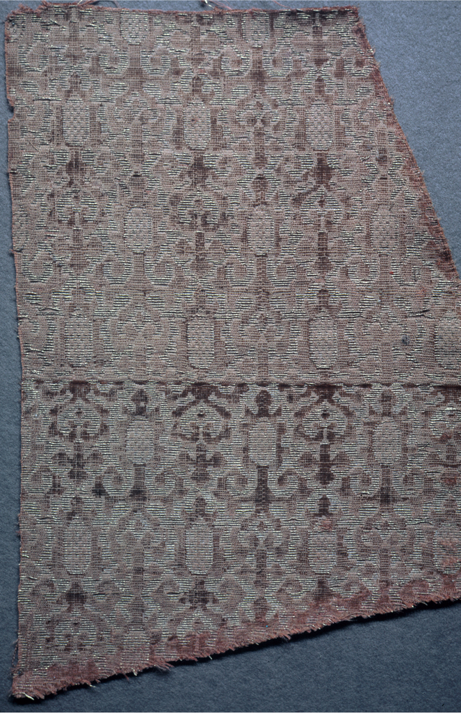 This is a Fragment. It is dated 17th century and we acquired it in 1902. Its medium is silk, metallic and its technique is supplementary warps forming raised pile in a plain weave foundation (velvet) with supplementary wefts. It is a part of the Textiles department.