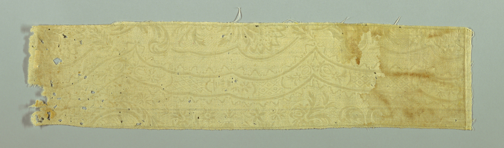 This is a Fragment. It is dated early 18th century and we acquired it in 1902. Its medium is wool and its technique is stamped (embossed) plain weave. It is a part of the Textiles department.