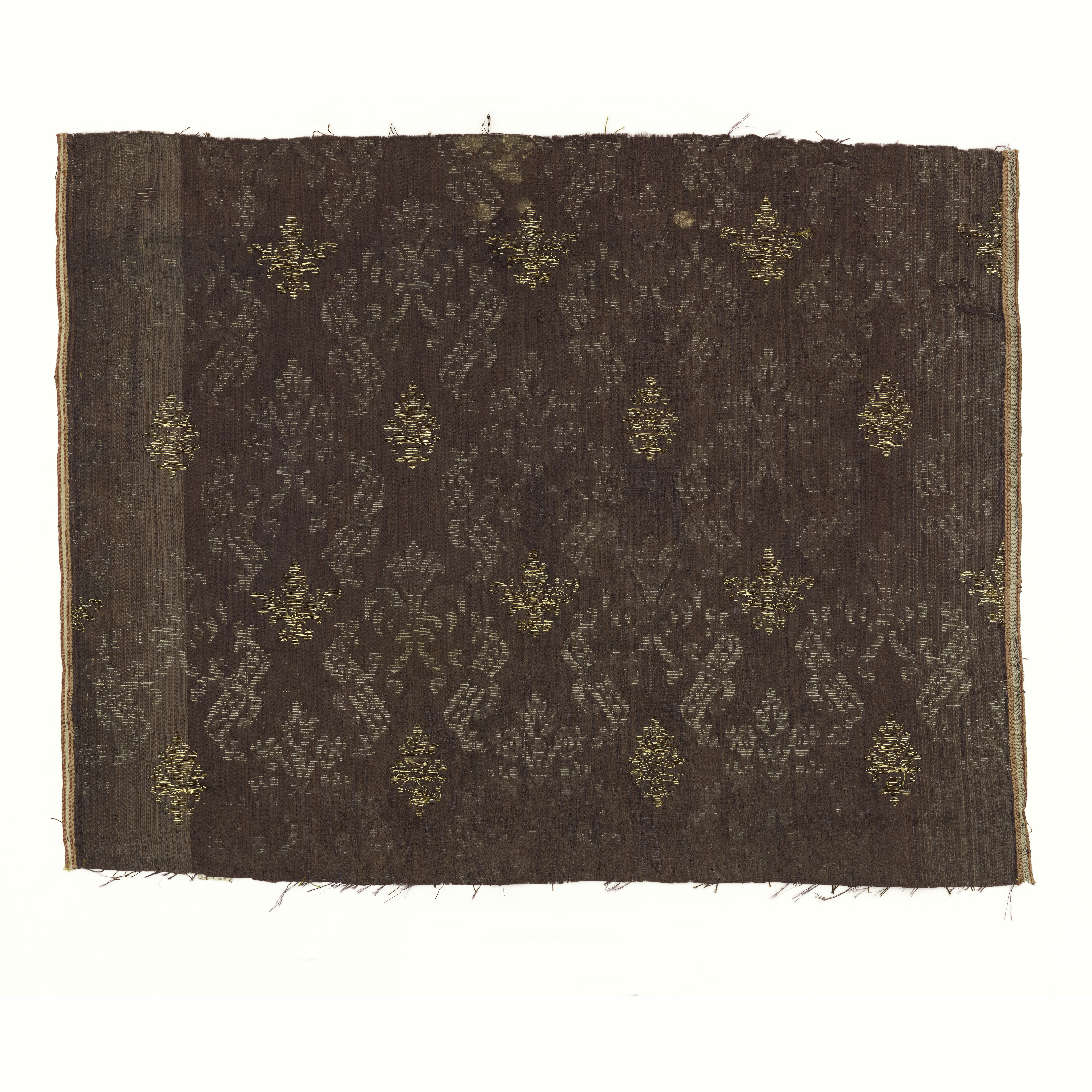This is a Fragment. It is dated 17th century and we acquired it in 1902. Its medium is silk, metallic and its technique is brocaded satin. It is a part of the Textiles department.