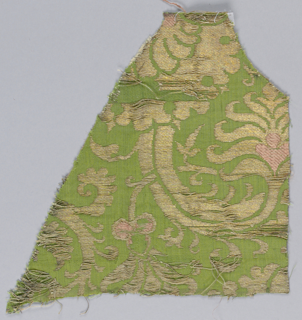 This is a Textile. It is dated ca. 1500 and we acquired it in 1902. Its medium is silk, gilt parchment wrapped around silk core and its technique is two partially interconnected structures; 4\1 satin plus 1\3 twill. It is a part of the Textiles department.