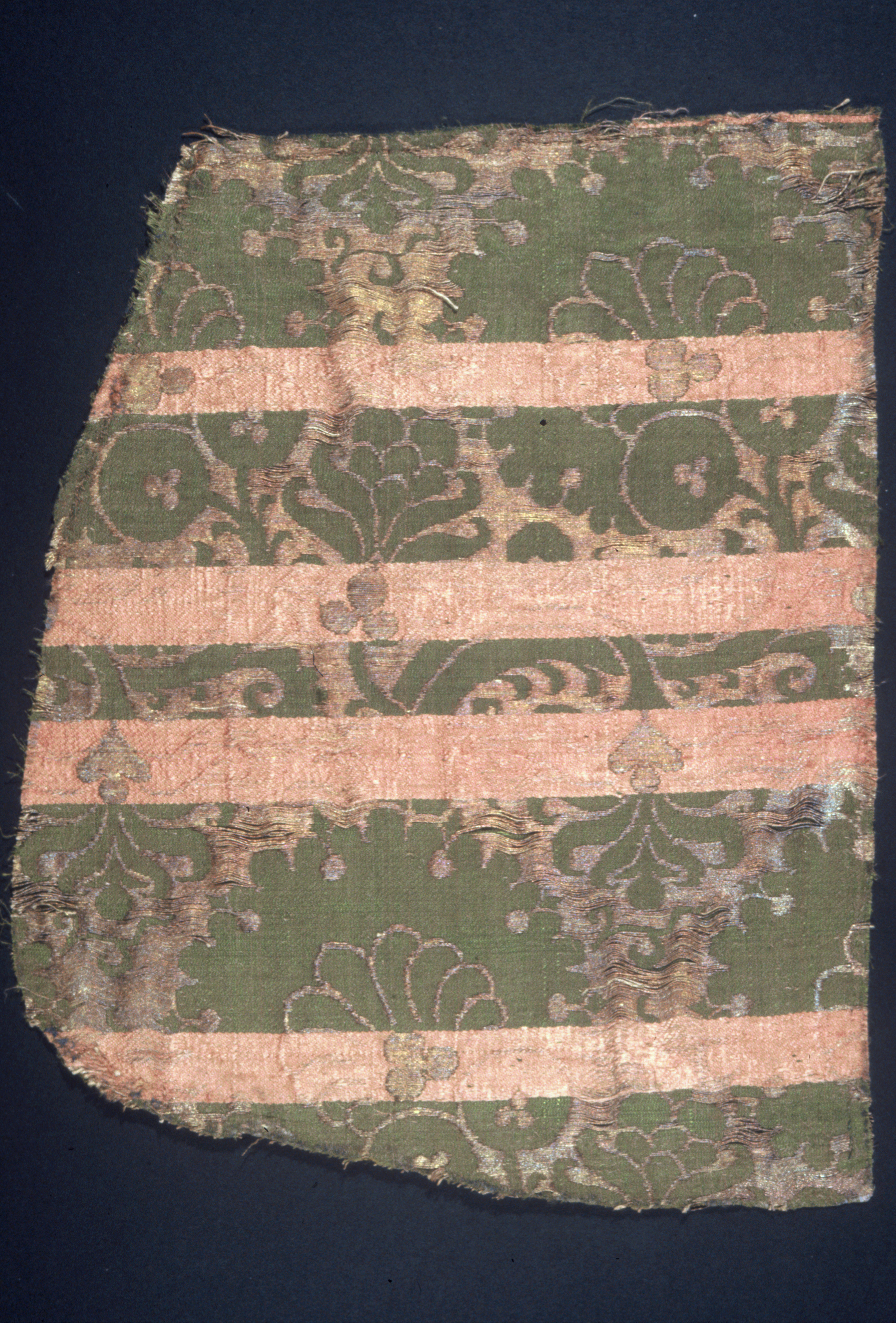 This is a Textile. It is dated ca. 1500 and we acquired it in 1902. Its medium is silk, gilt parchment wrapped around silk core and its technique is two partially interconnected structures; 4\1 satin plus 1\3 twill. It is a part of the Textiles department.