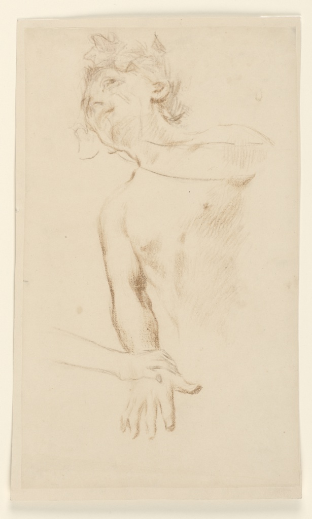 Drawing, Study for a man, “Vintage Festival,” Mendelssohn Glee Club, New York, NY; Robert Frederick Blum (American, 1857–1903); USA; pastel crayon on tracing paper mounted to board; 20.2 × 7.3 cm (7 15/16 × 2 7/8 in.); Gift of Henrietta Haller; 1904-16-3
