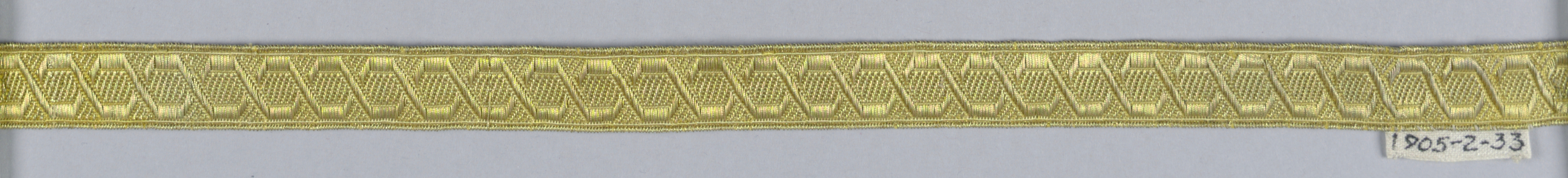 This is a Trimming. It is dated mid-18th century and we acquired it in 1905. Its medium is silk, metallic thread and its technique is woven. It is a part of the Textiles department.