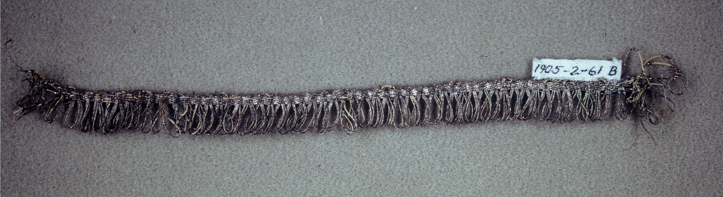 This is a Fringe. It is dated 18th century and we acquired it in 1905. Its medium is silver foil on a silk core and its technique is woven. It is a part of the Textiles department.