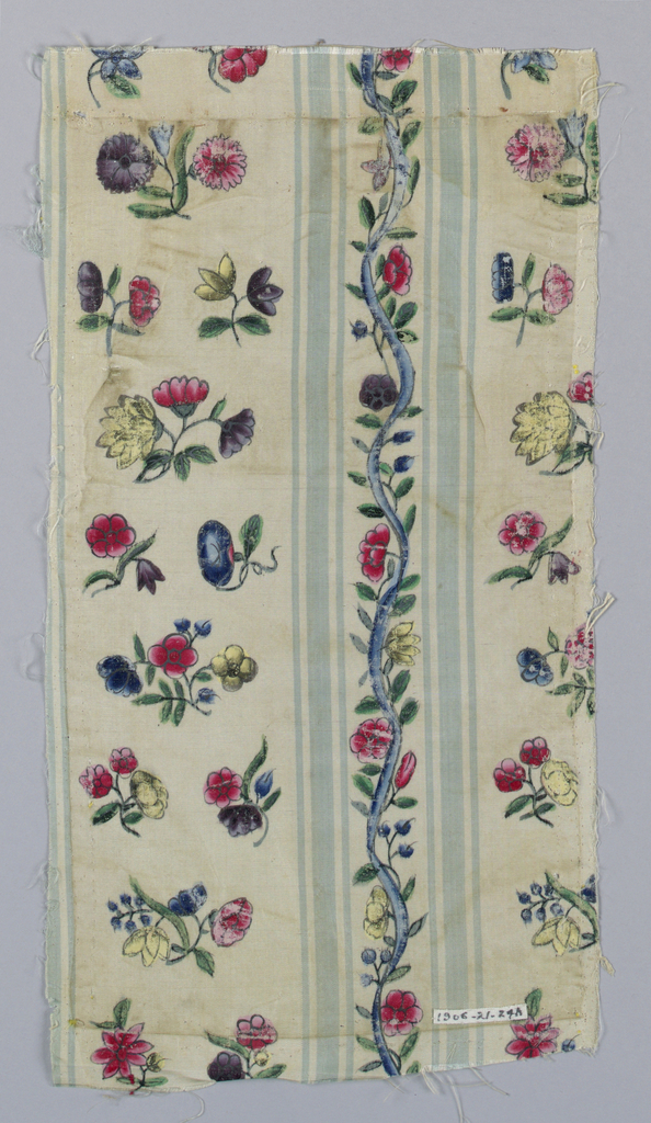 This is a Fragments. It is dated 18th century and we acquired it in 1906. Its medium is tempera on silk and its technique is printed and painted on plain weave. It is a part of the Textiles department.