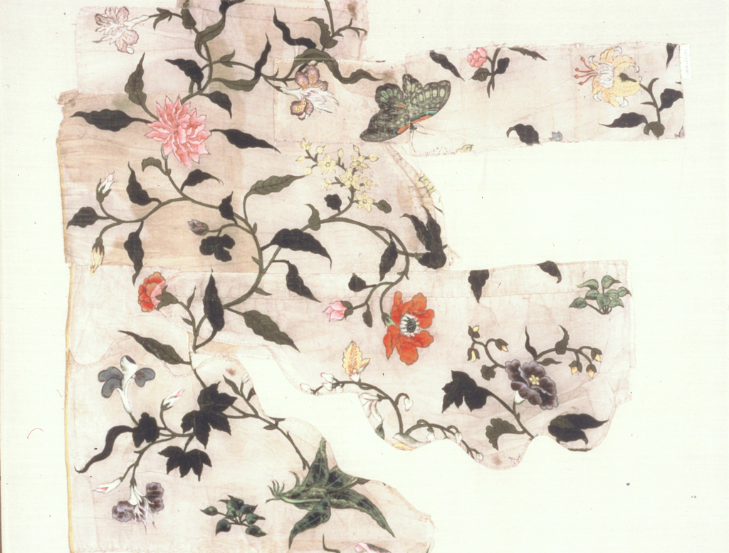 This is a Fragment. It is dated 18th century and we acquired it in 1906. Its medium is silk and its technique is printed and painted silk. It is a part of the Textiles department.