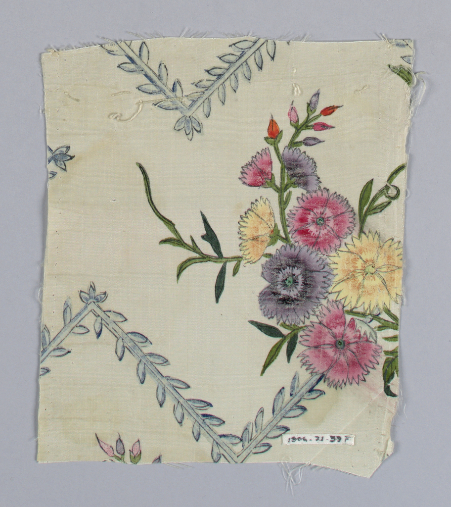 This is a Fragments. It is dated 18th century and we acquired it in 1906. Its medium is silk and its technique is printed and painted on plain weave. It is a part of the Textiles department.
