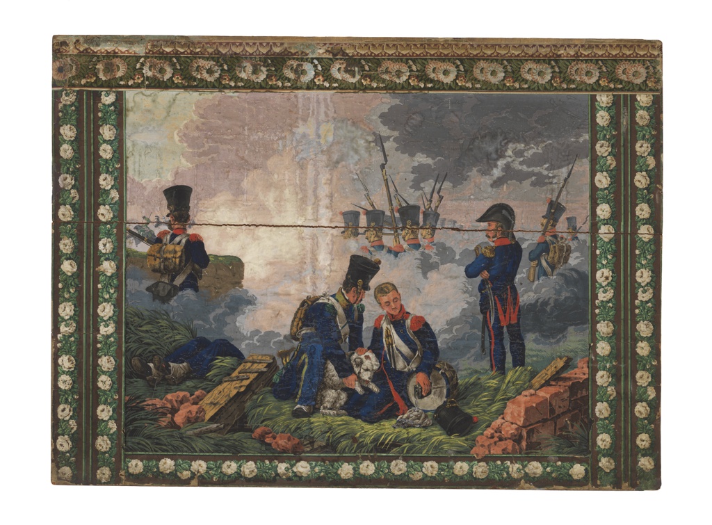 Fireboard, Fireboard Decorated with 'Le Chien du Regiment'; Manufactured by Zuber & Cie (France); France; block printed paper, flocked paper, wood faced, distemper colors; H x W x D: 94 × 128 × 4.5 cm (37 in. × 50 3/8 in. × 1 3/4 in.); Gift of Mrs. A.S. Hewitt; 1907-15-4