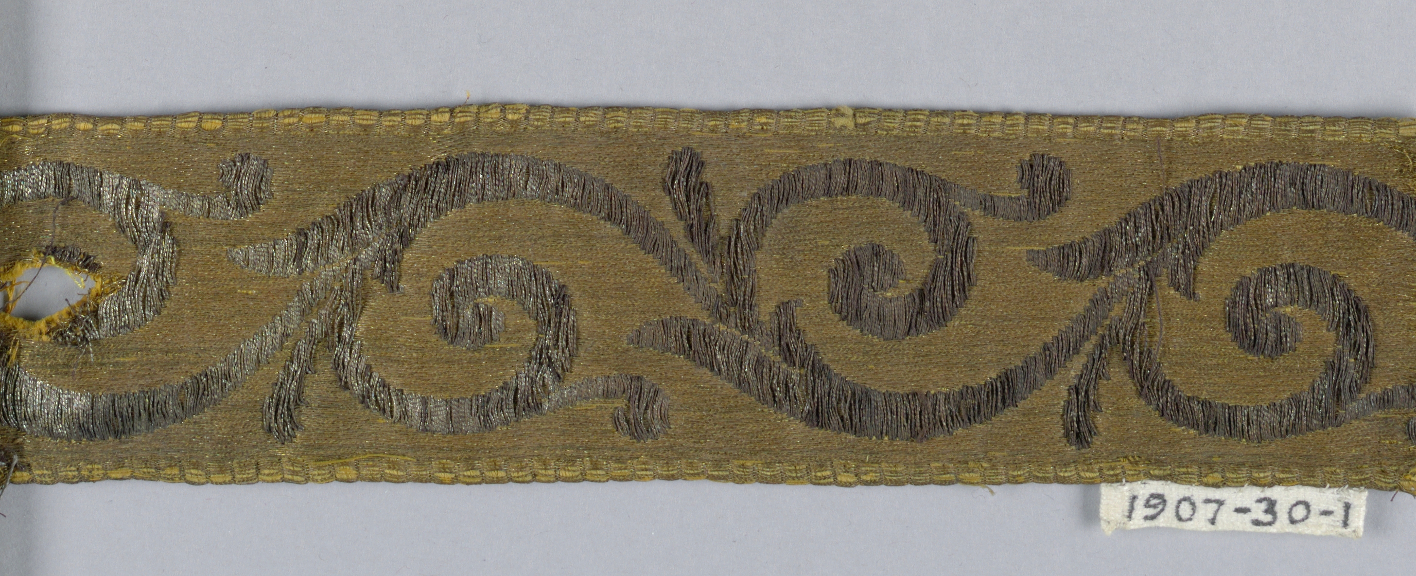 This is a Fragment. It is dated late 19th century and we acquired it in 1907. Its medium is silk and metallic thread. It is a part of the Textiles department.