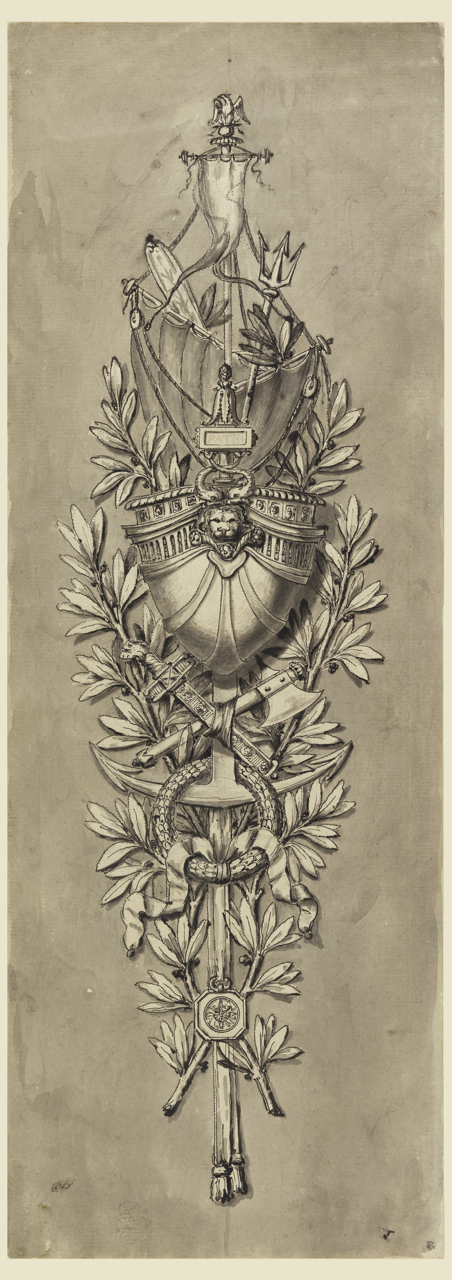Drawing, Design for a Marine Trophy; France; pencil, pen, and ink with chinese black ink on paper, pricked; 46.8 × 16.4 cm (18 7/16 × 6 7/16 in.); Purchased for the Museum by the Advisory Council; 1908-26-130