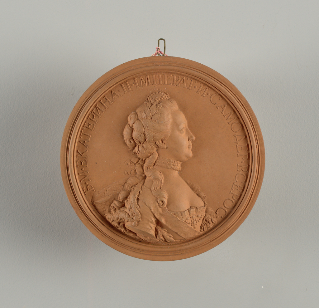 This is a Medallion. It was created by Jean-Baptiste Nini. It is dated copied ca. 1900 and we acquired it in 1909. Its medium is earthenware, salmon colored. It is a part of the Product Design and Decorative Arts department.
