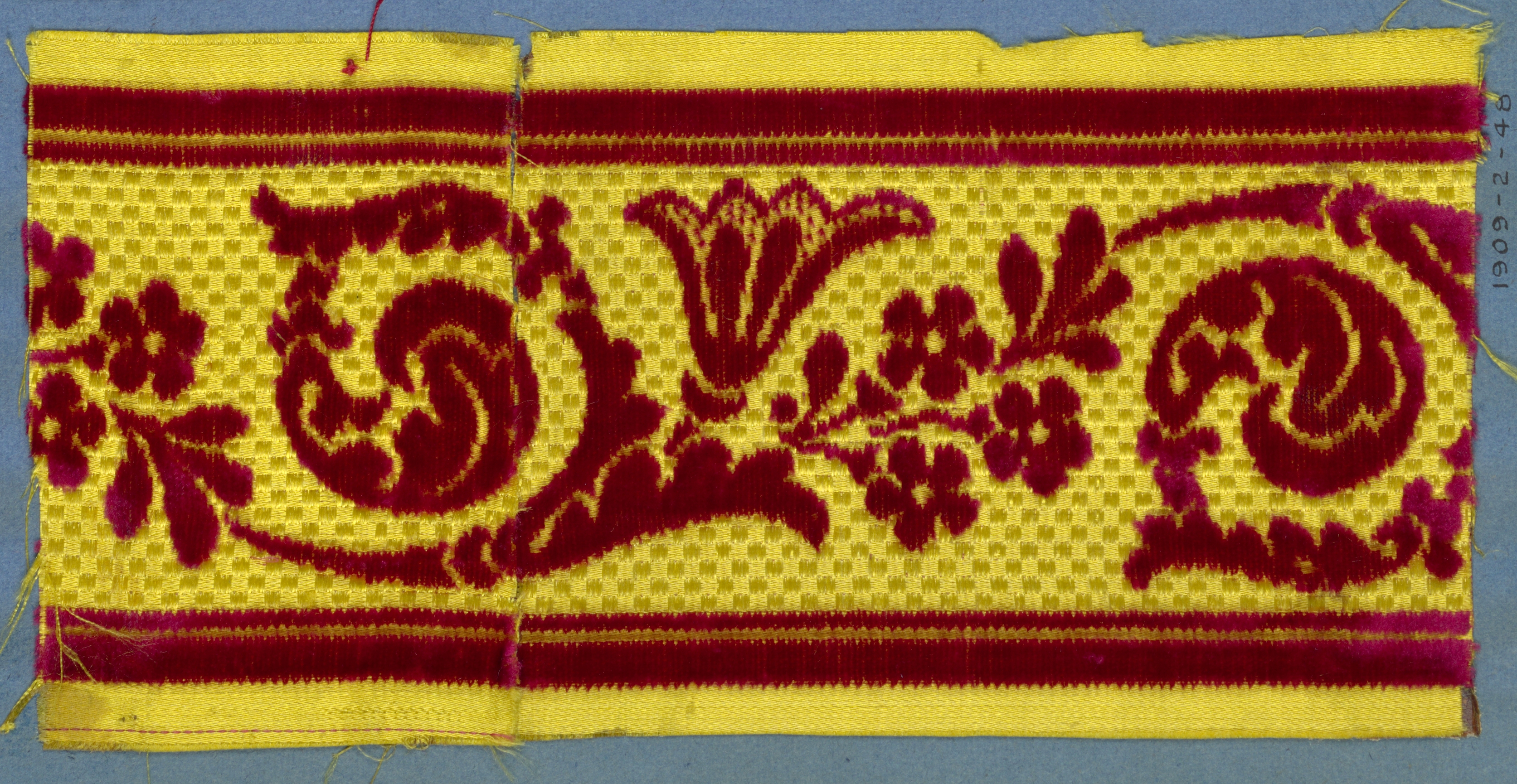 This is a Trimming. It is dated early 19th century and we acquired it in 1909. Its medium is silk and its technique is cut supplementary warp pile (velvet). It is a part of the Textiles department.