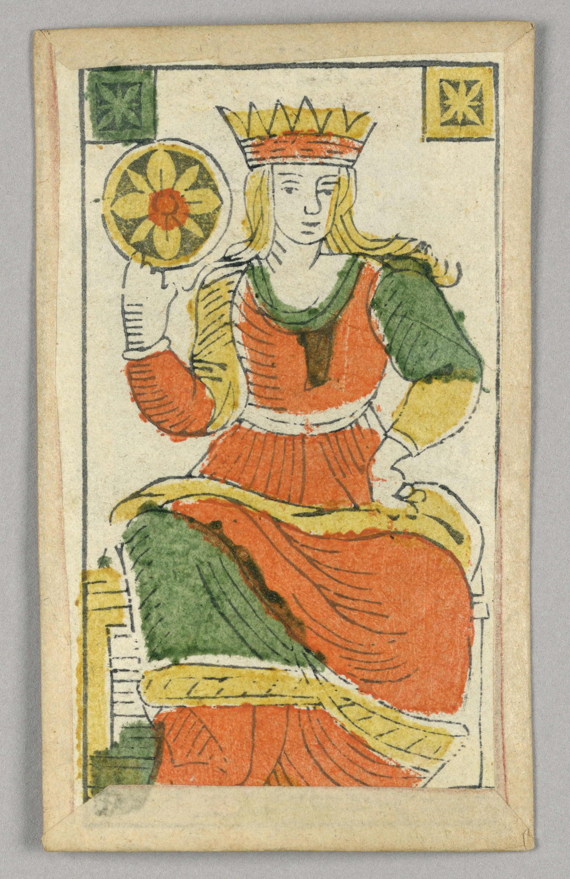 This is a Playing Card. It is dated 17th century and we acquired it in 1909. Its medium is stencil-colored woodblock print. It is a part of the Drawings, Prints, and Graphic Design department.