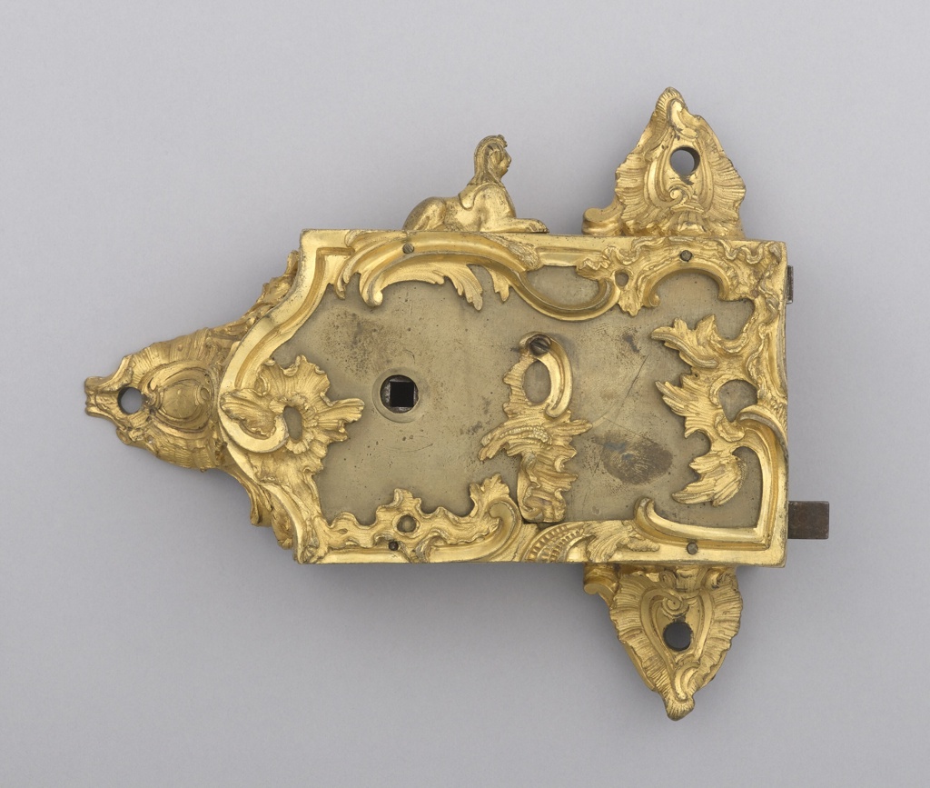 This is a Lock. It is dated ca. 1745 and we acquired it in 1909. Its medium is bronze, gold. It is a part of the Product Design and Decorative Arts department.