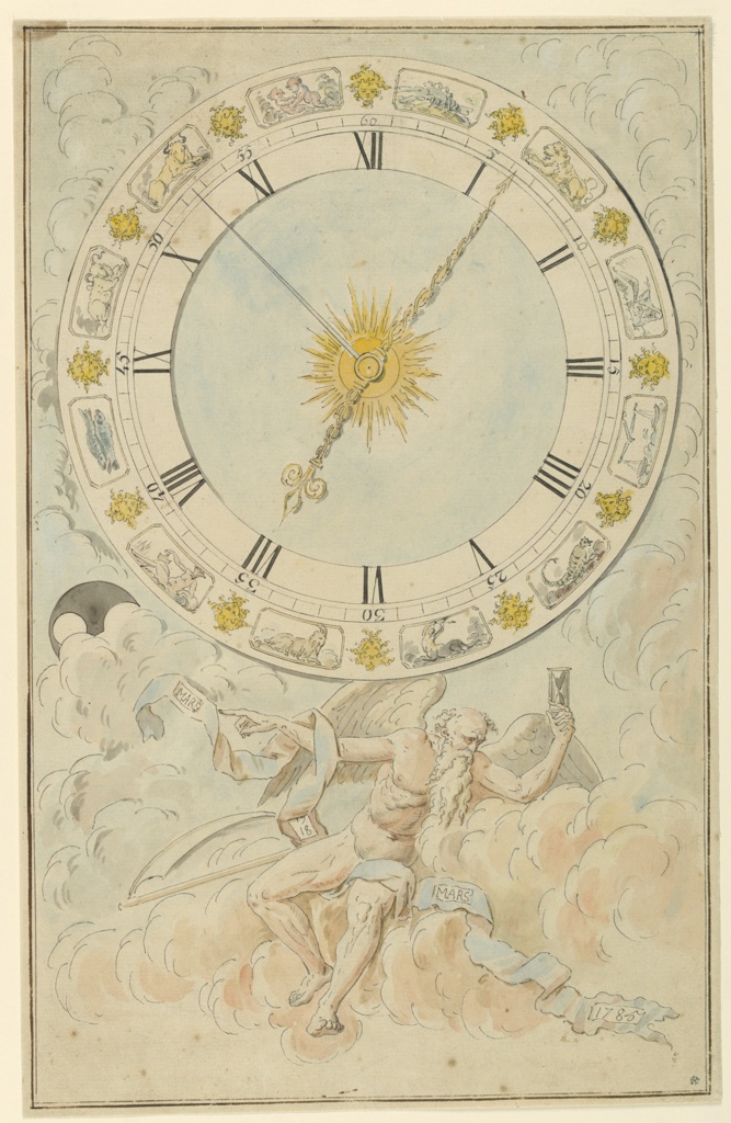 Drawing, Clock face with the signs of the zodiac; Attributed to Louis-Félix de La Rue; France; pen and black ink, brush and watercolor, graphite on paper; 39.3 × 25.4 cm (15 1/2 in. × 10 in.); Purchased for the Museum by the Advisory Council; 1911-28-126