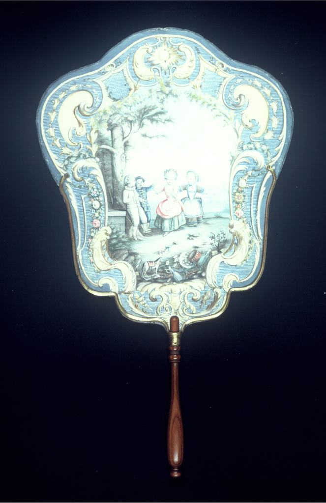 This is a Handscreen. It is dated mid-18th century and we acquired it in 1911. Its medium is painted paper leaf, turned wood handle. It is a part of the Textiles department.