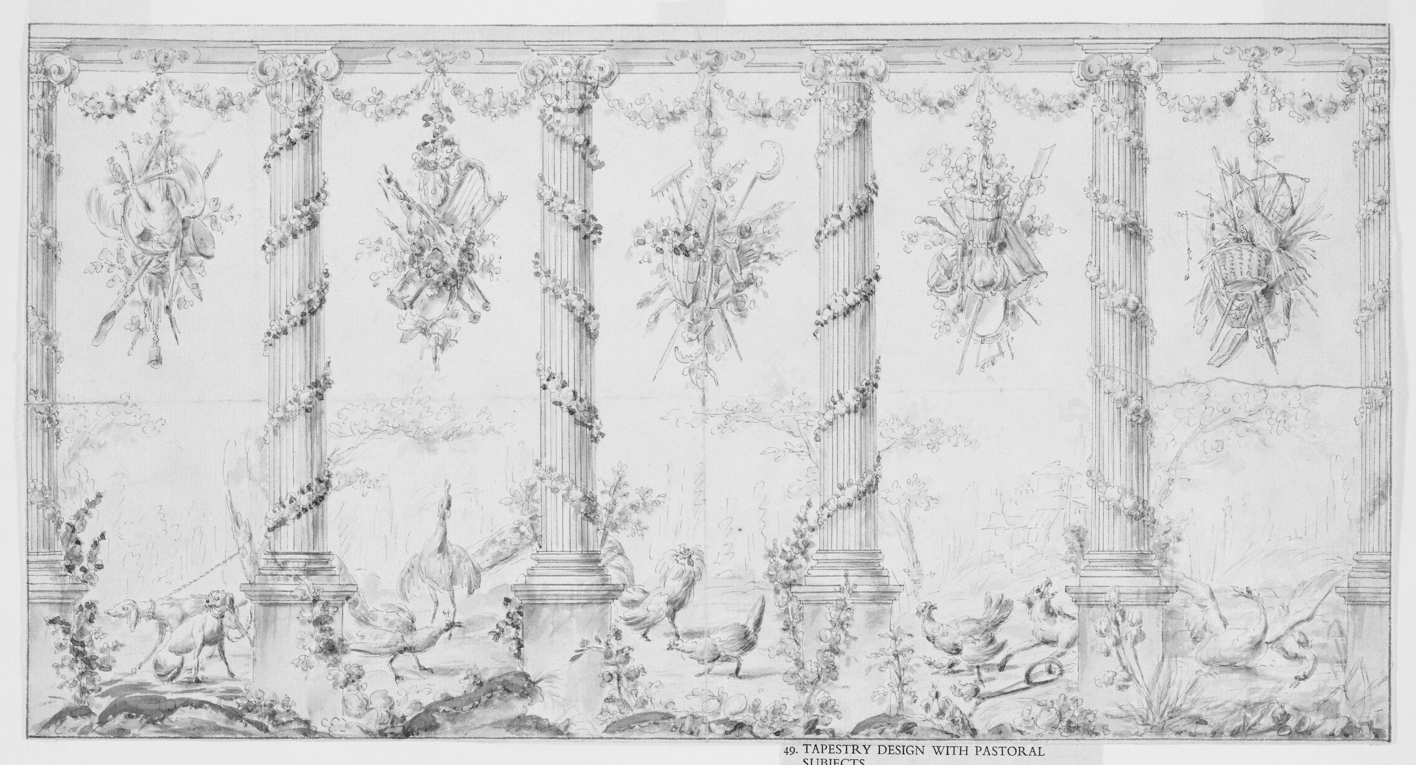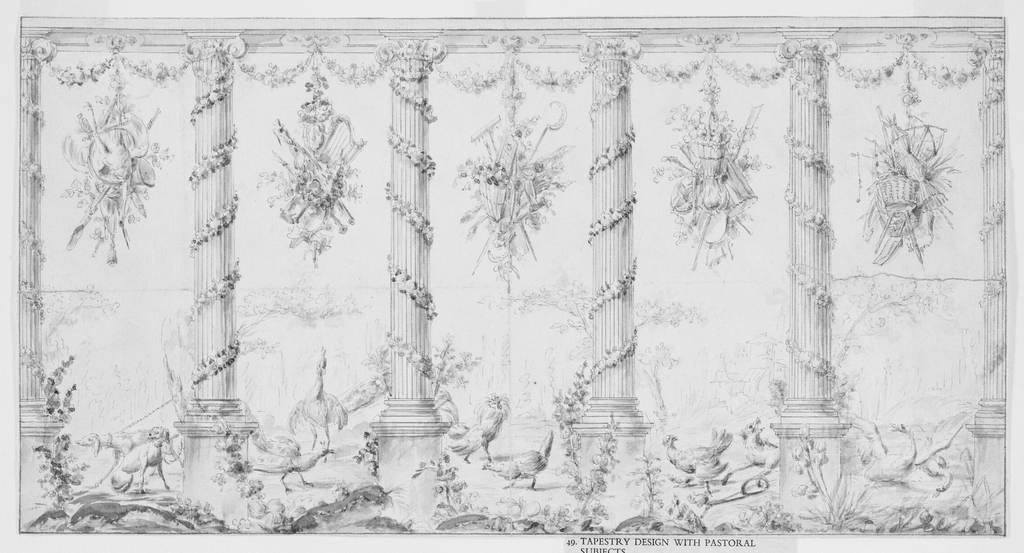 Drawing, Project for Tapestry Dedicated to Farm Life; Jean-Baptiste Marie Huet (French, 1745 - 1811); France; pen and black ink, brush and wash on off-white laid paper; 19.7 x 37.7 cm (7 3/4 x 14 13/16 in.) Mat (Mat): 35.6 x 45.7 cm (14 x 18 in.); Purchased for the Museum by the Advisory Council; 1911-28-142