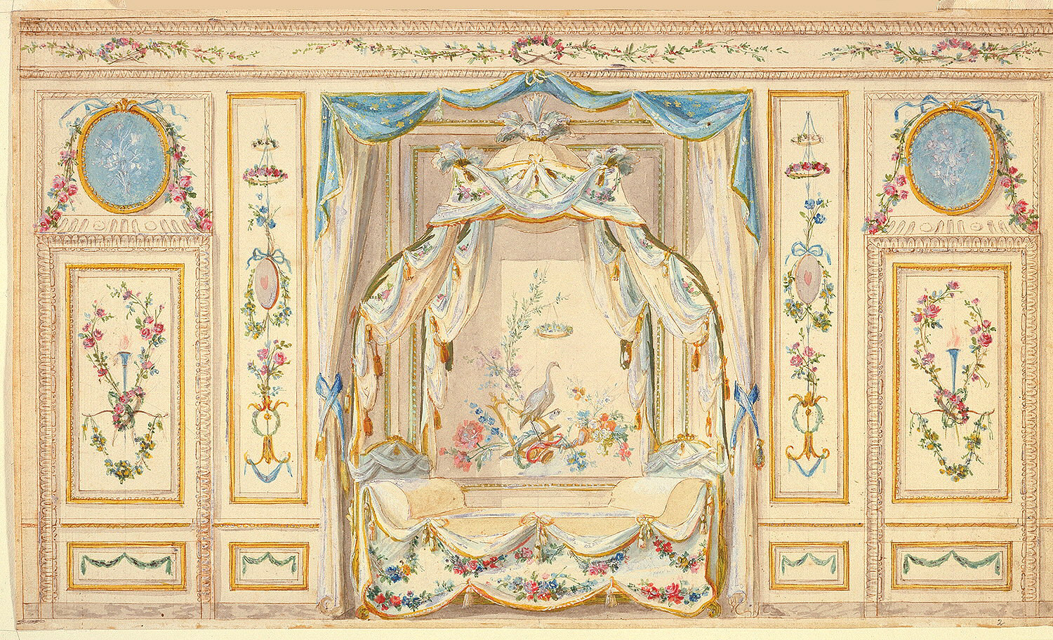 Drawing, Wall Elevation of a Bedroom Alcove; Pierre Ranson (French, 1736–1786); France; pen and brown ink, brush and watercolor, white gouache, graphite on white laid paper; 28.1 x 47.2 cm (11 1/16 x 18 9/16 in.) ; Purchased for the Museum by the Advisory Council; 1911-28-261