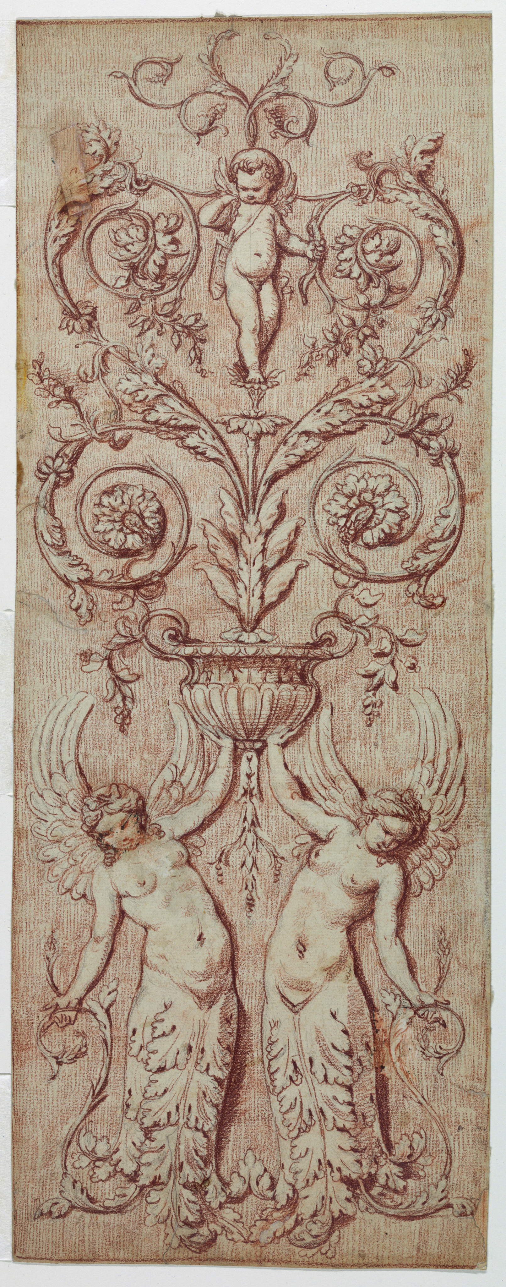 Drawing, Design for a carved panel; Designed by Gilles Paul Cauvet (French, 1731 - 1788); France; black and red crayon on paper; Sheet: 59.4 x 22.6 cm (23 3/8 x 8 7/8 in.); Purchased for the Museum by the Advisory Council; 1911-28-30