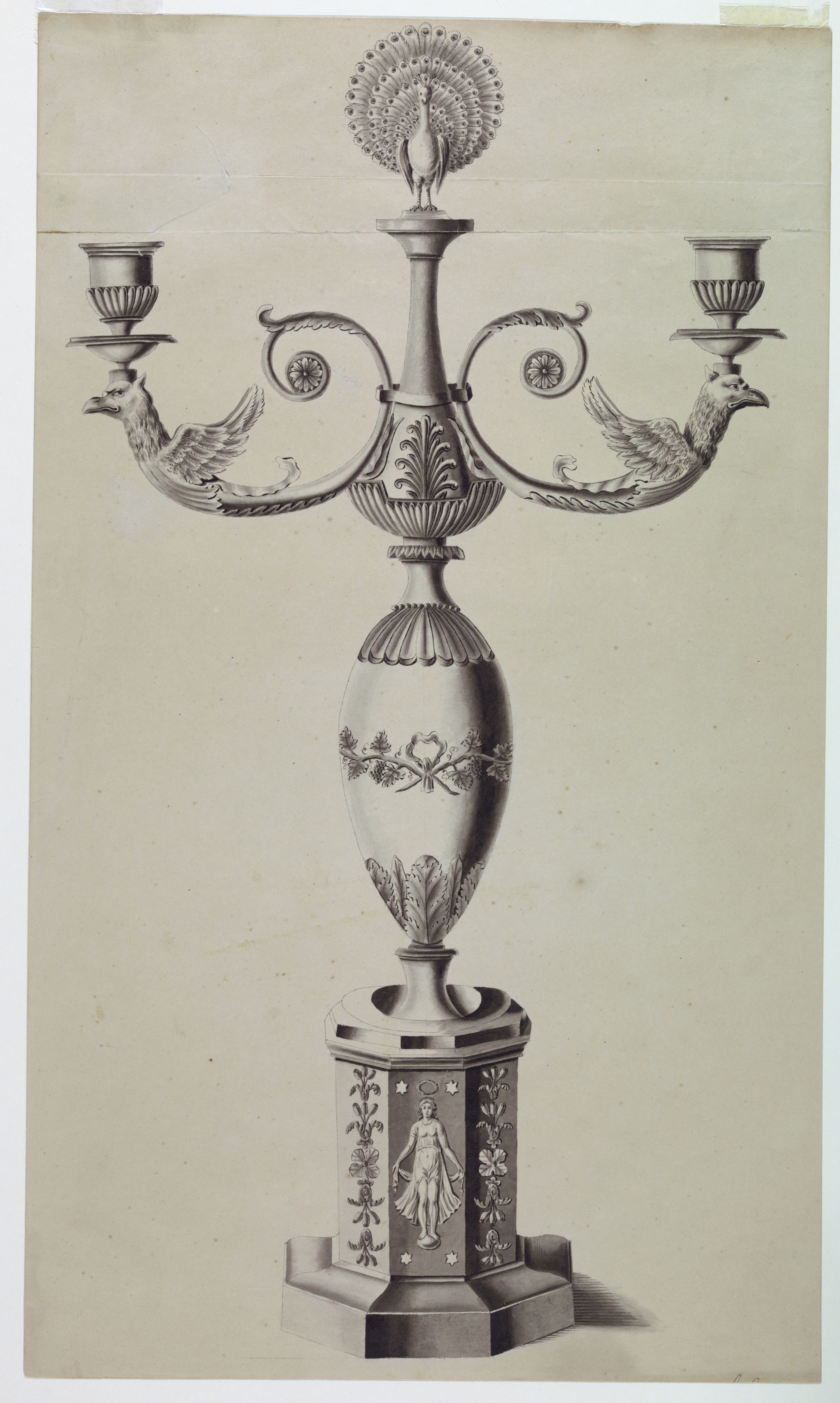 Drawing, Design for a Candlestick; Designed by Joseph Anton Seethaler II (German, 1799–1868); Germany; pen and ink, brush and watercolor, graphite on paper; 59.2 × 34.7 cm (23 5/16 × 13 11/16 in.); Purchased for the Museum by the Advisory Council; 1911-28-380