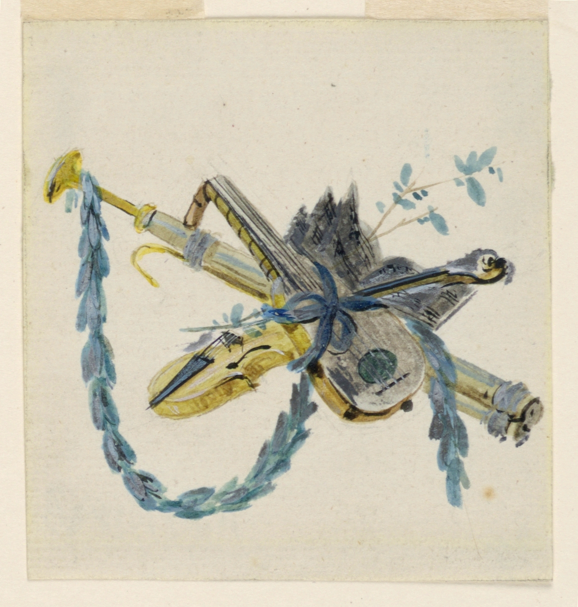 Drawing, Trophies with Historical Attributes; Pierre Ranson (French, 1736–1786); France; black chalk, pen, ink, watercolor, paper; 9.5 × 8.9 cm (3 3/4 × 3 1/2 in.); Purchased for the Museum by the Advisory Council; 1911-28-387-2
