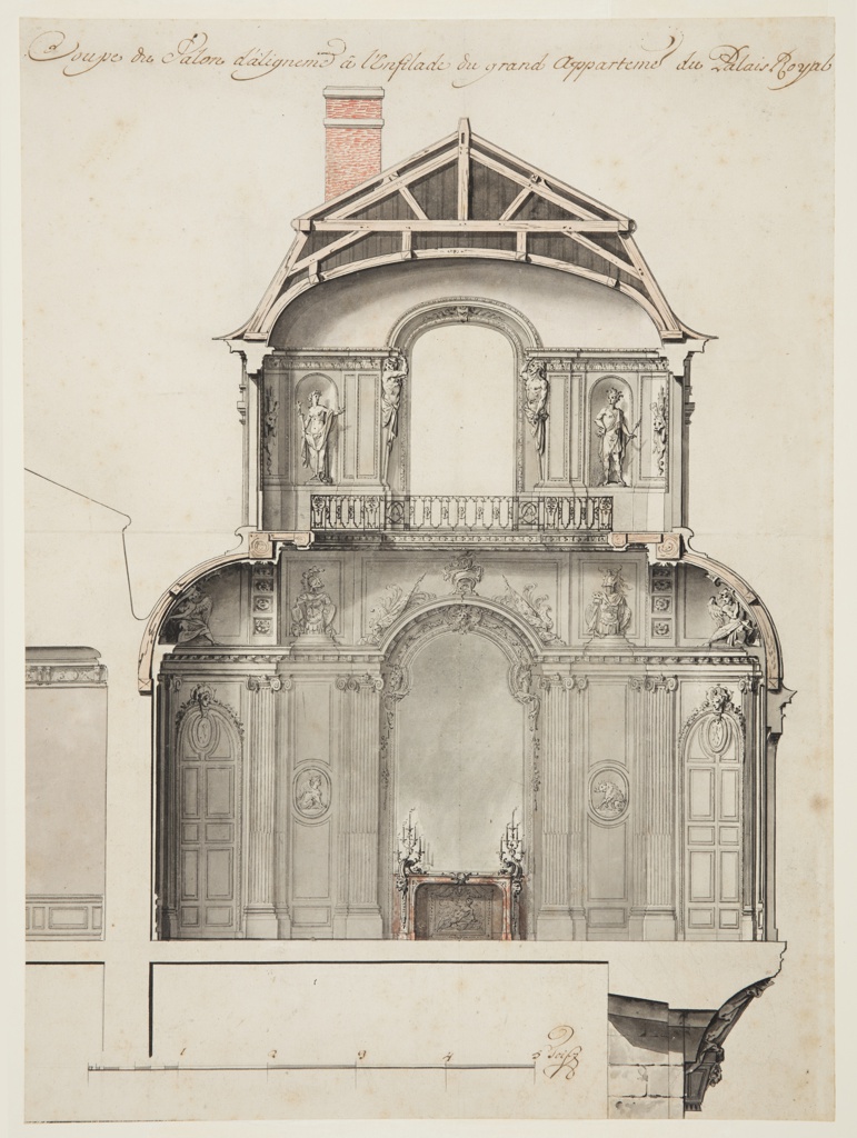 Inscribed in pen and brown ink across top of sheet: Coupe du Salon d'alignement à l'Enfilade du grand Apartement du Palais Royal; lower left: the scale 5 Toises.