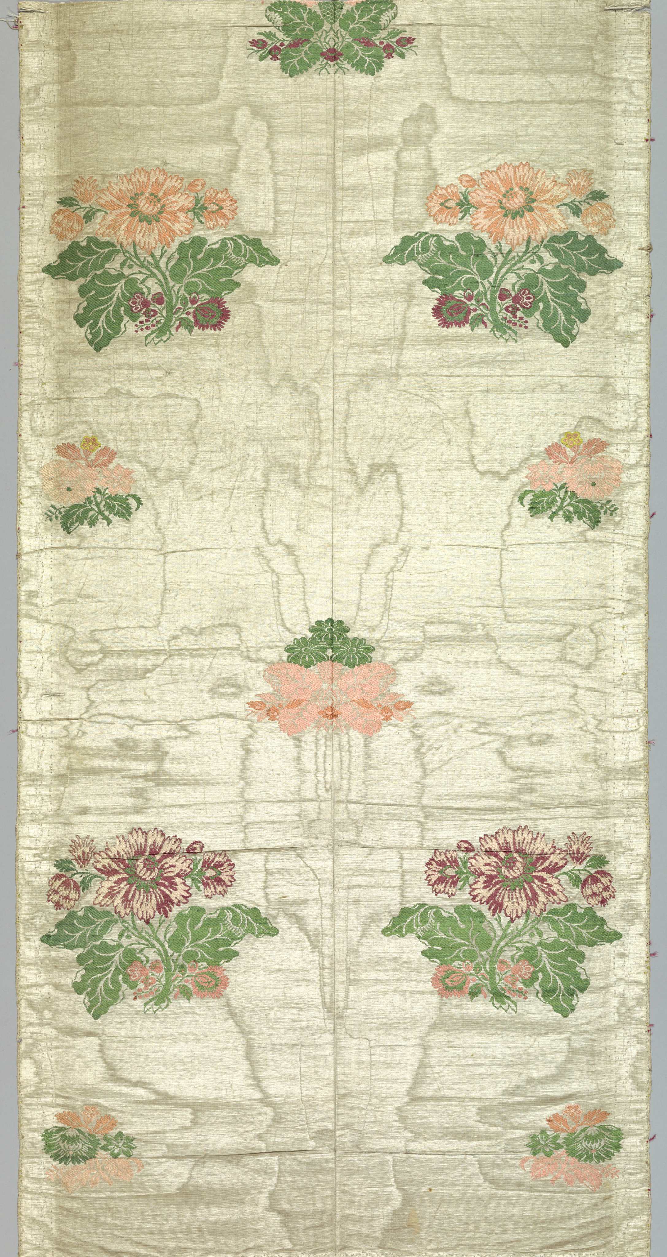 This is a Fragment. It is dated 19th century and we acquired it in 1912. Its medium is silk and its technique is plain weave with discontinuous supplementary weft; moire. It is a part of the Textiles department.