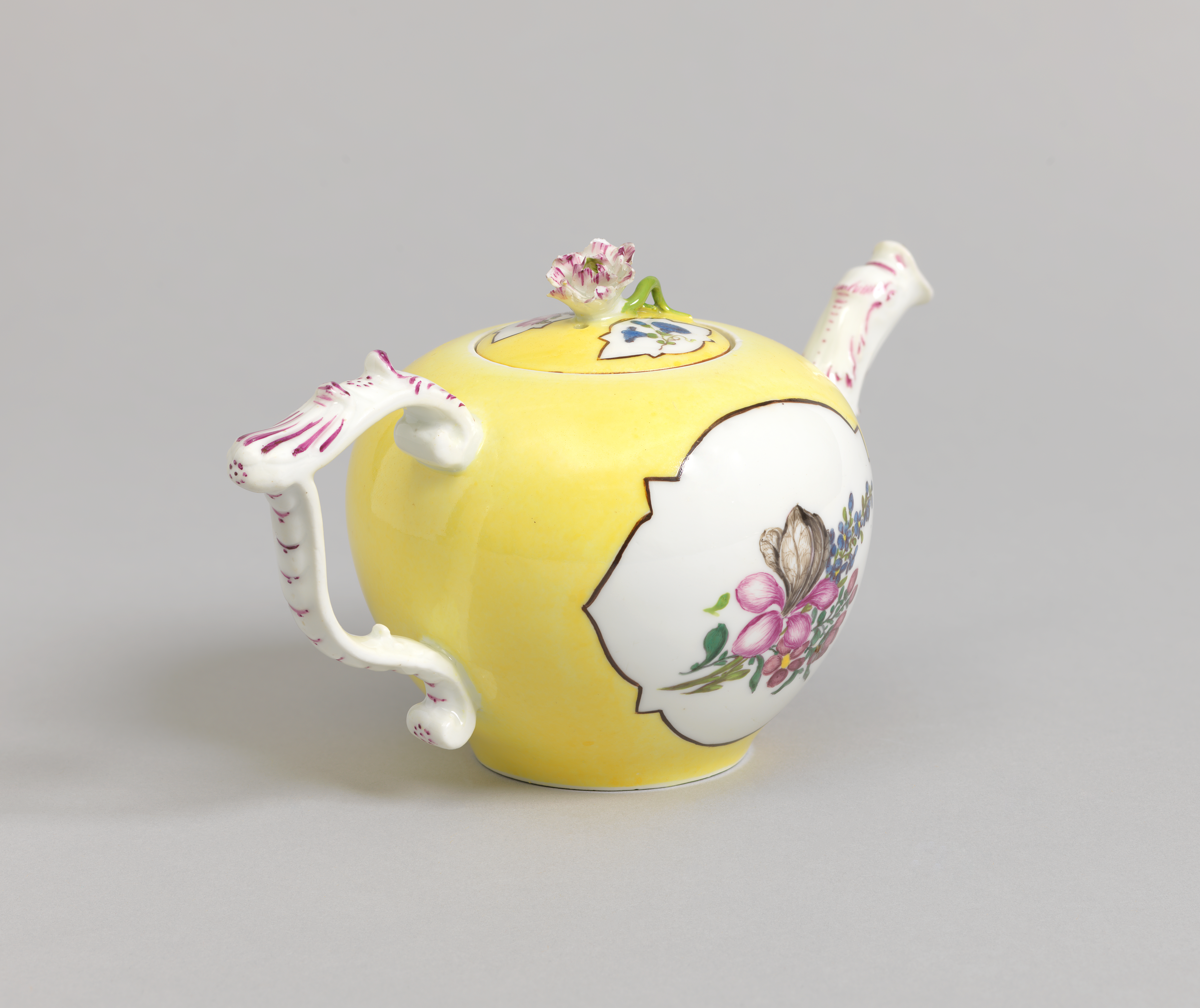 This is a teapot. It was manufactured by Meissen Porcelain Manufactory and Meissen Porcelain Factory. It is dated mid- 18th century and we acquired it in 1912. Its medium is hard paste porcelain, vitreous enamel. It is a part of the Product Design and Decorative Arts department.