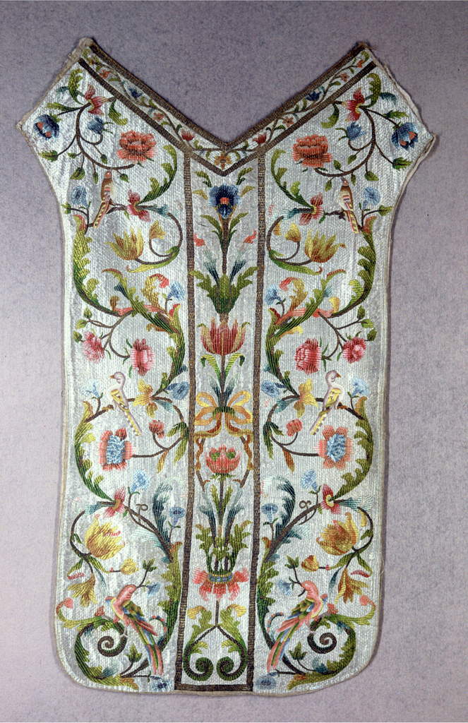 This is a Vestment. It is dated late 17th century and we acquired it in 1912. Its medium is silk and metal thread on linen; lined with linen and its technique is laid stitch embroidery on plain weave. It is a part of the Textiles department.