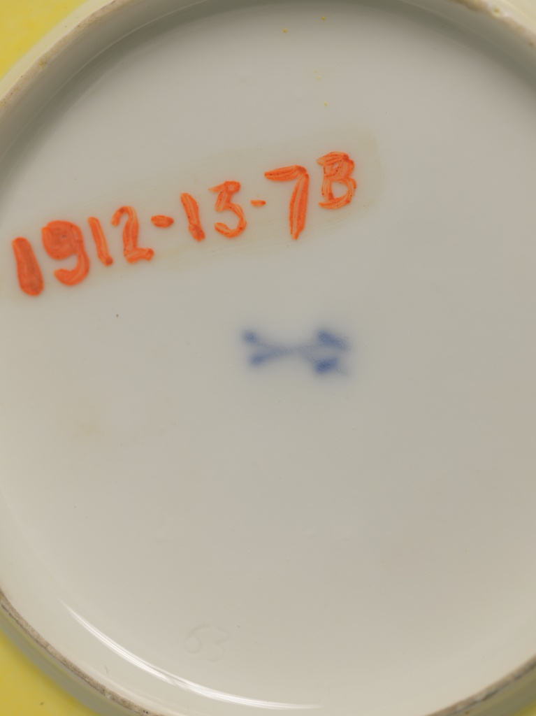 Underside of cup: [1] double crossed swords, painted in underglaze blue (Meissen Porcelain Manufactory mark) Underside of saucer: [1] double crossed swords, painted in underglaze blue (Meissen Porcelain Manufactory mark) [2] "63", impressed underglaze (typeset style font)