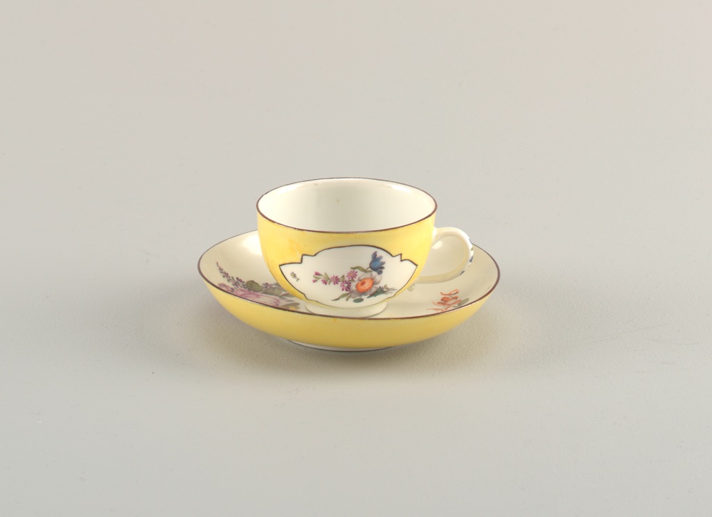 This is a cup and saucer. It was manufactured by Meissen Porcelain Manufactory and Meissen Porcelain Factory. It is dated mid- 18th century and we acquired it in 1912. Its medium is hard paste porcelain, vitreous enamel. It is a part of the Product Design and Decorative Arts department.