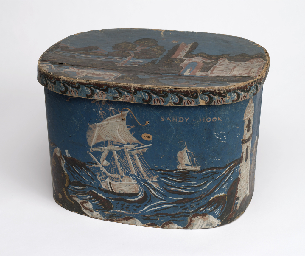 Bandbox And Lid, Sandy Hook; USA; block-printed paper on pasteboard support; H x W x D: 28.3 x 43.2 x 34.3 cm (11 1/8 in. x 17 in. x 13 1/2 in.); Gift of Mrs. Frederick F. Thompson; 1913-45-11-a,b