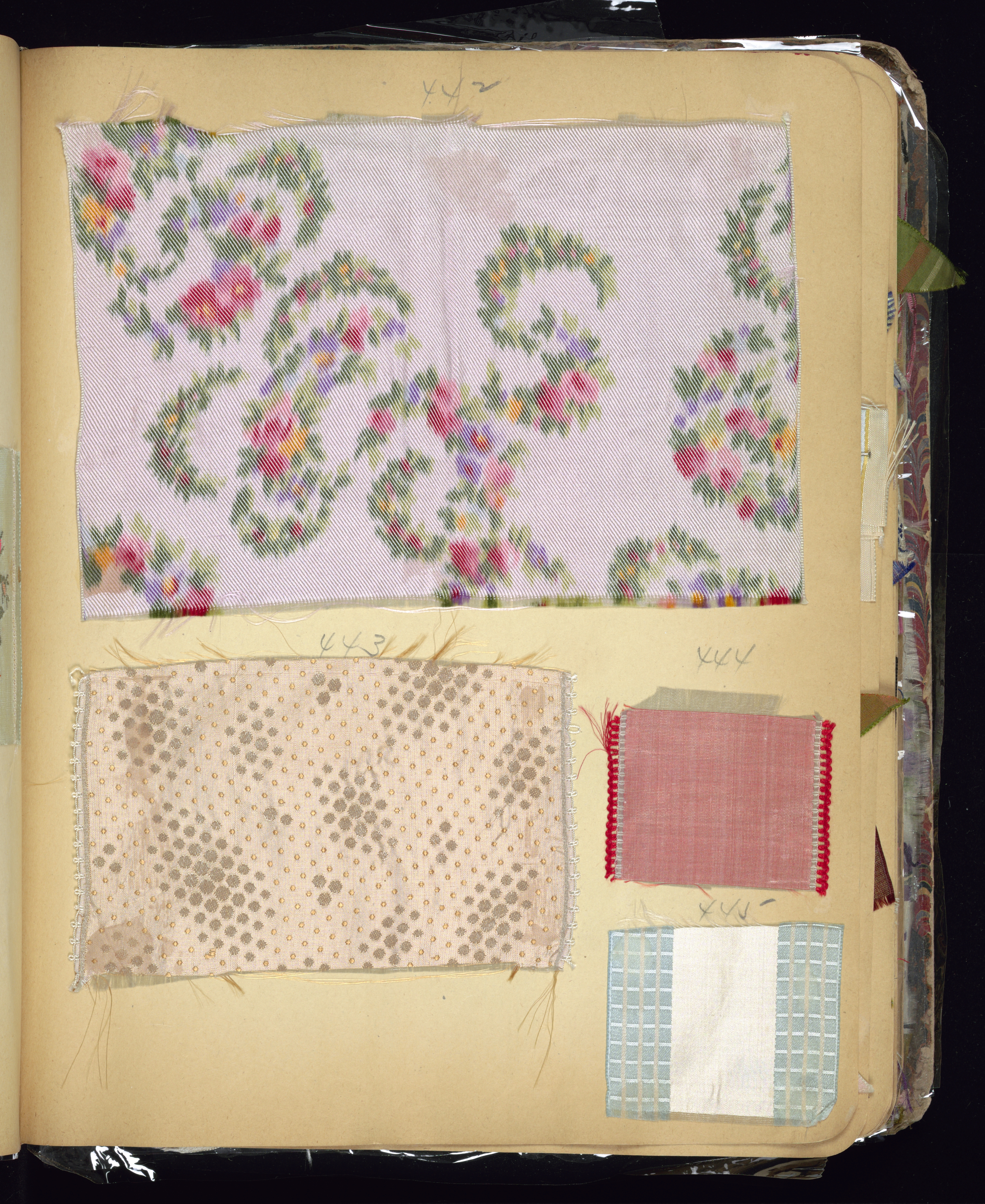 Inscription inside front cover: Presented by Mr. John G. Neeser. 11 Volumes containing samples of Brocades, Silks, Chiffons, Galloons, Velvets. About the period 1800–1815. November 1913.