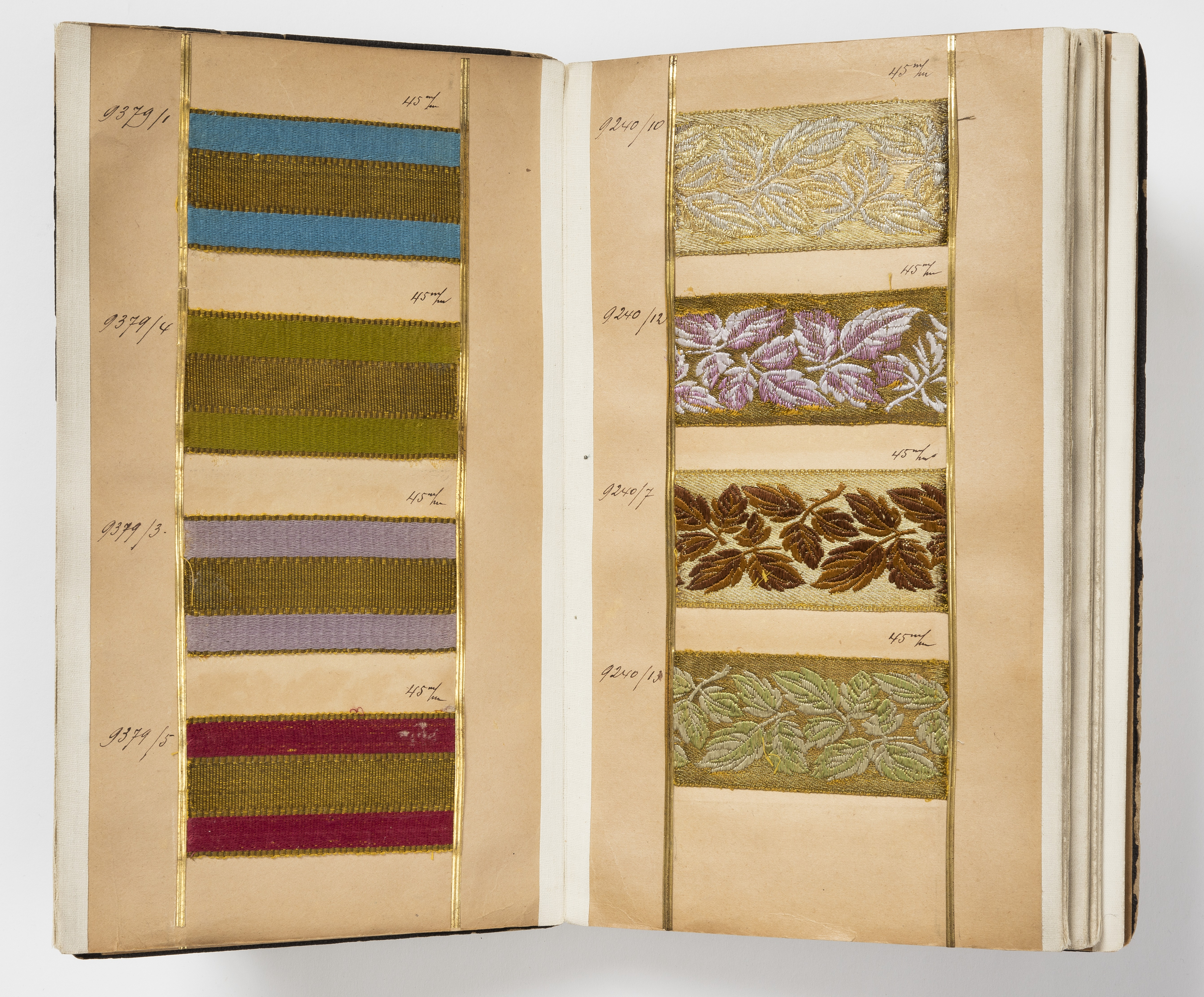 Manufacturer's Sample Book (France); paper, cardboard, silk, metal-wrapped silk cord, metal foil; H x W x D (closed): 29.5 x 17.1 x 3.5 cm (11 5/8 x 6 3/4 x 1 3/8 in.) 42 pages; Gift of John G. Neeser; 1914-22-6