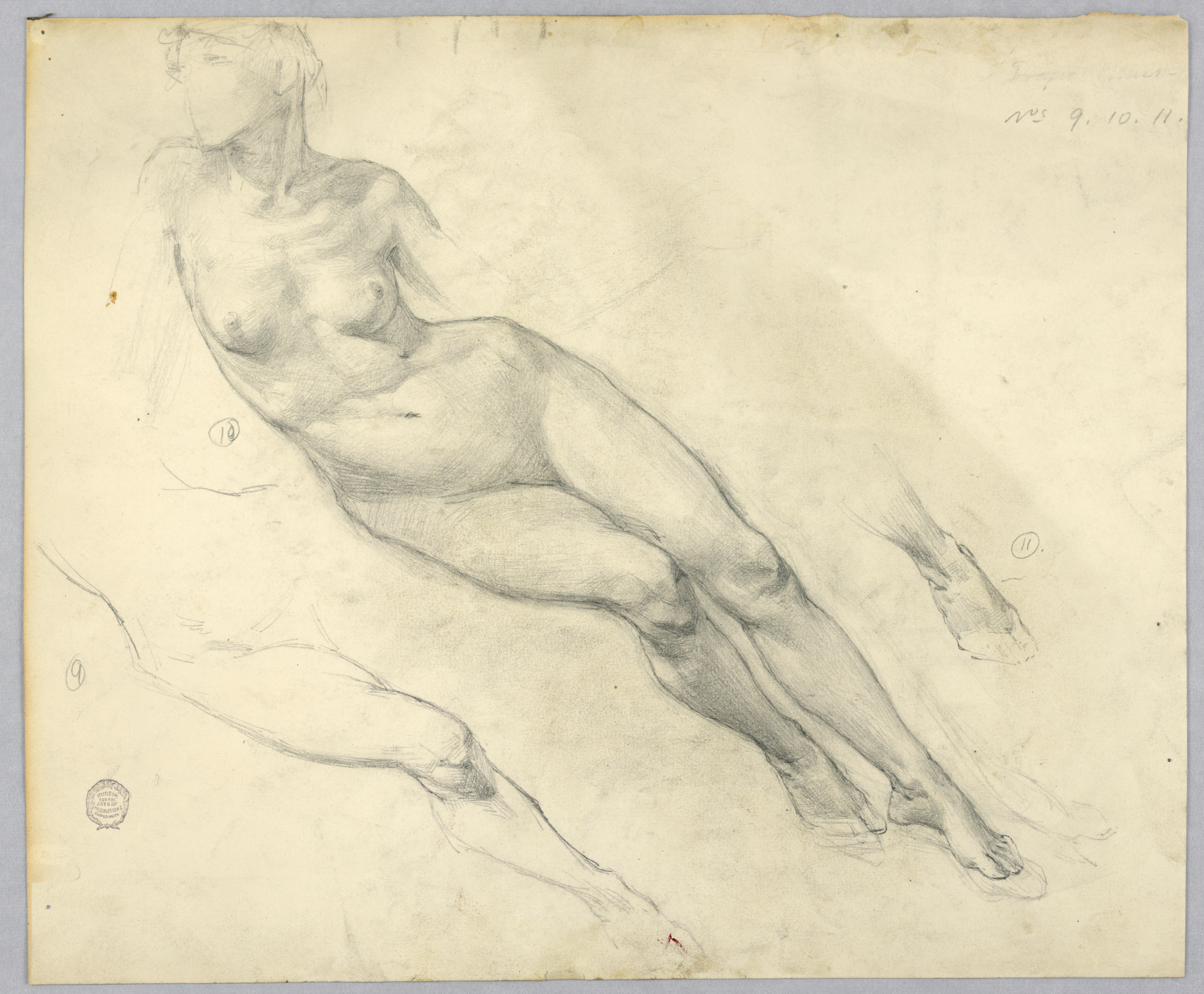 Inscribed in graphite, upper right: "Nos 9. 10. 11."; sketches numbered in graphite, lower left, near leg: "9"; center left, near figure: "10"; center right, near foot: "11"