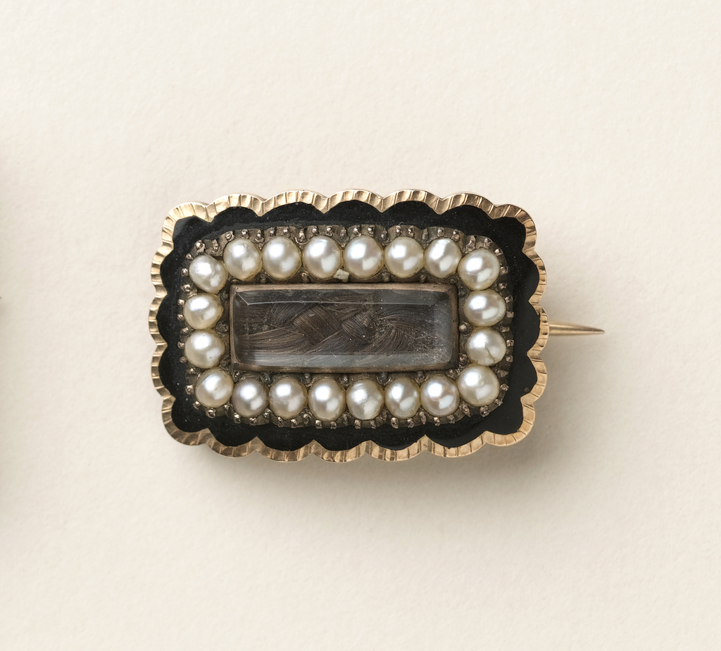This is a brooch. It is dated ca. 1830–40 and we acquired it in 1916. Its medium is enameled gold set with pearls, braided hair under glass cover. It is a part of the Product Design and Decorative Arts department.
