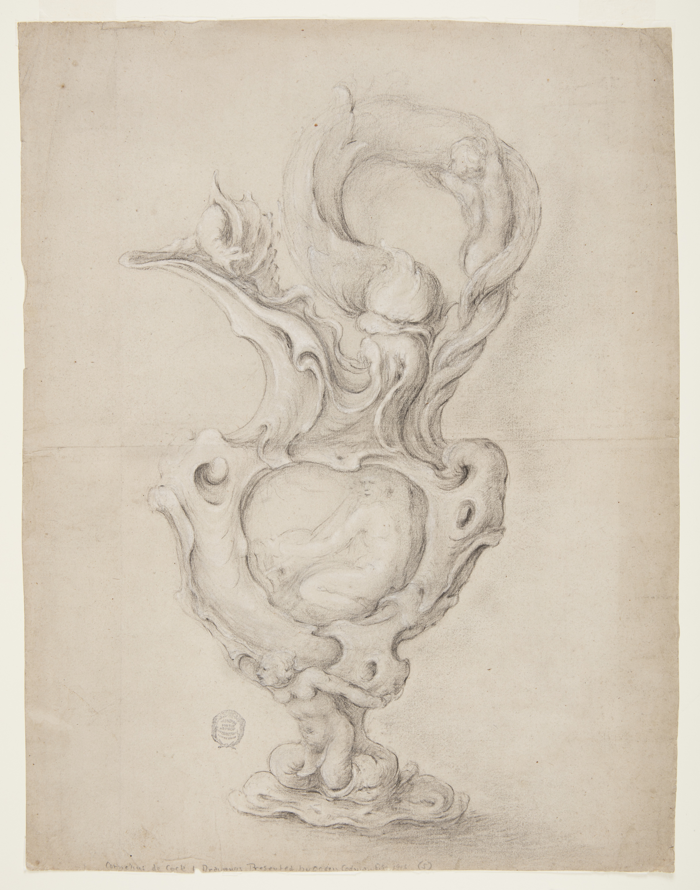 In the first half of the 17th century Dutch metalsmiths drew inspiration from the elongated forms of Mannerism and the biomorphic motifs of the grotesque to create the curvaceous auricular style. These two drawings for ewers are examples of the designs created by Paul and Adam van Vianen, Janus Lutma, and a circle of craftsmen. Stable metal vessels become transformed into fluid, fanciful objects. Here handles take on the shape of dolphins and mermaids become entwined or embedded in the ewers’ forms. The designs recall those of Enea Vico from a century earlier.