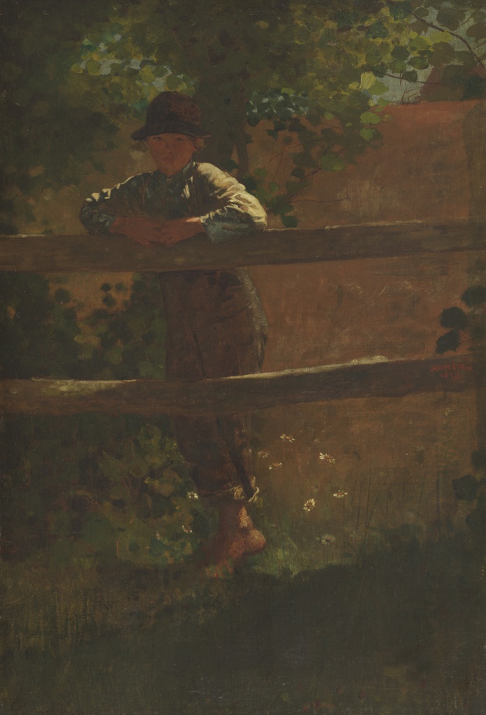 Signed and dated in brush and red oil paint, at right on fence: HOMER / 1873.