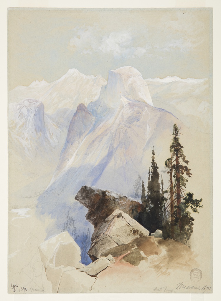 Thomas Moran was one of the artists who in the mid-nineteenth century produced landscape images of the West that contributed to and reinforced the development of an American identity. These views, however, were frequently constructed, edited, or manipulated to reinforce a sense of national pride and feeling of unity during and immediately following the Civil War. This ethereal view of the famous site of Half Dome in Yosemite was based on Moran’s many sketches of the scene, drawings and photographs by other artists, as well as his recollections of his many visits there.
