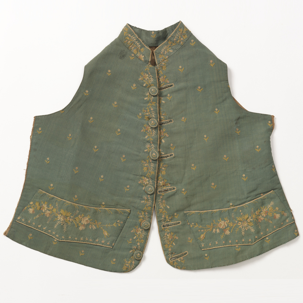 This is a Waistcoat. It is dated 1750–1800 and we acquired it in 1917. Its medium is silk embroidery on silk foundation and its technique is embroidered in chain stitch on ribbed plain weave. It is a part of the Textiles department.