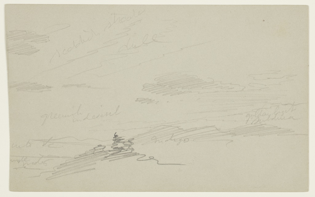 Inscribed: in graphite, upper left: reddish streaks / dull; in graphite, center left: greenish indescrib[able]; in graphite, center right: golden light / subdued; in graphite, lower left: into sky / purple / [redder?]; in graphite, lower center: Indigo; in graphite, verso lower center: Buck wheat / green grey white
