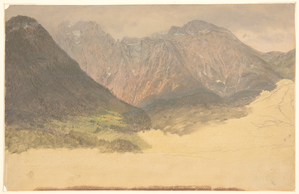 Drawing, Hoher Göll and Hohes Brett from Berchtesgaden, Bavaria (Germany); Frederic Edwin Church (American, 1826–1900); USA; brush and oil paint, graphite on tan paperboard; 32.6 × 50.5 cm (12 13/16 × 19 7/8 in.); Gift of Louis P. Church; 1917-4-1131