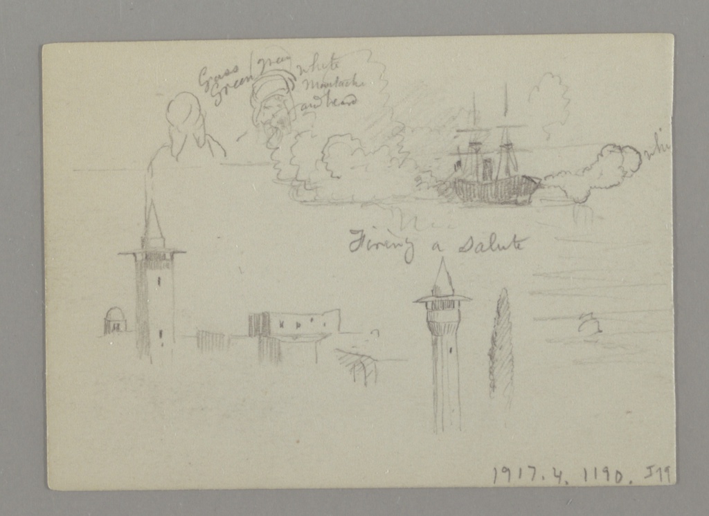 Inscribed: in graphite, upper left: Beyrout; in graphite, center left: Darker / warmish grey; in graphite, lower left: green / Dark green / brown green; in graphite, verso upper center: Grass / Green / (green) / white / Moustache / and head; in graphite, verso center: Firing a Salute