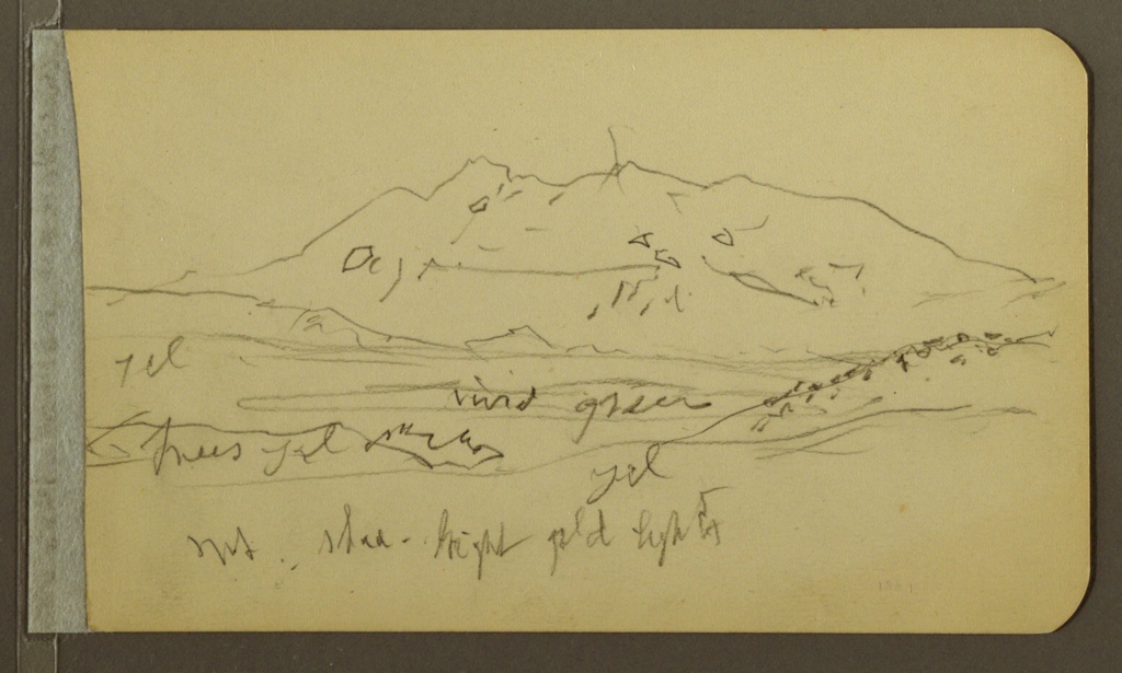 Inscribed in graphite, center left: yel / Trees yel; center: vivid green / yel; lower center: Mt. Shad. bright gold lights