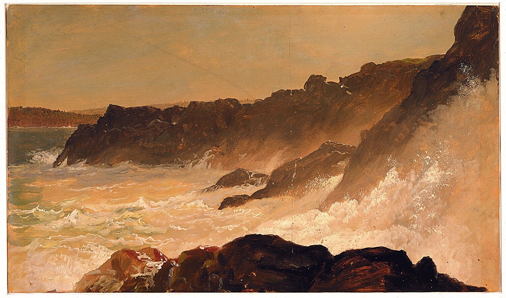 From his trip to Mount Desert Island during the Civil War, Church focused on the viewer’s direct confrontation with the roiling sea and its awesome power. This plein-air sketch executed on the spot was developed into a large painting exhibited in 1863 at the National Academy of Design. In the finished canvas, Church enhanced the sublime effects by adding the sun piercing through a pink and blue sky, perhaps alluding to the end of the Civil War through divine guidance. Reviewing the picture at the National Academy, one critic wrote, “Here is magnificent force in the sea…regarded as pure power; when it dies its final death in mad froth and vapor…we feel ourselves in an audacious actual presence, whose passion moves us almost like a fact of surf.” The painting was acquired by the New York railroad and steamship magnate Marshall Owen Roberts in 1863 to hang in his Fifth Avenue mansion along with his previously acquired Church pictures Mount Katahdin (1853) and Under Niagara (1862, now lost).